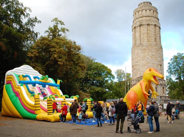 Nach der Begrüßung durch einen acht Meter hoher Luftgebläse-Dinosaurier direkt am Bismarckturm und dem ausgiebigen Toben auf der XXL-Saurierrutsche kann sich jeder auf Erkundungstour entlang der verschiedenen Stationen begeben und bei einer Saurierrallye selbst aktiv werden. Zu entdecken gibt es ein Dinolabor und ein Ausgrabungscamp für die kleinen Forscherinnen und Forscher. Aber natürlich darf auch ein Dino „Meet and Greet“ nicht fehlen. Außerdem gibt es ein Sandsuchspiel, eine Fossiliensuche, Bastelangebote und die Möglichkeit, sich ein steinzeitlich oder buntes Tattoo auf die Haut zaubern zu lassen. Nicht nur die Stationen sind von Dinosauriern geprägt, auch unter den Tieren findet sich die eine oder andere Dinosaurierspur. Als Mitveranstalter sind vor Ort vertreten: Bunte Steine e.V., die Stadtbücherei, das Neanderthal Museum Mettmann, die Naturwissenschaftliche Vereinigung Hagen e.V. sowie die Wirtschaftsjunioren Mittleres Ruhrgebiet.