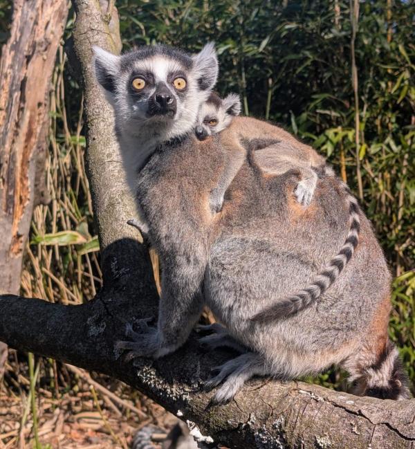 Bereits am 7. März 2026 wurden zwei Katta-Jungtiere geboren. In den ersten Lebenswochen halten sich die Kleinen noch eng am Bauch ihrer Mutter fest. Bald werden sie jedoch auf den Rücken wechseln, um von dort aus mutig ihre Umgebung zu erkunden. Kattas sind vor allem für ihre markanten schwarz-weiß geringelten Schwänze bekannt, die sie im hohen Gras wie Fahnen zur Kommunikation nutzen.