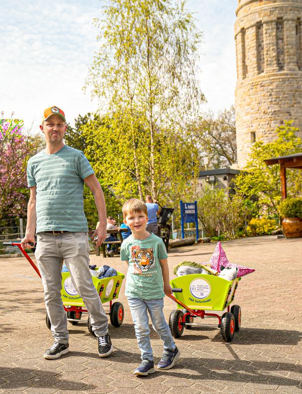 Foto©Tierpark_Bochum_3: Schon beim Ausprobieren kamen die neuen Bollerwagen bei den ersten Testern aus Dorsten – eine Familie mit zwei Kindern – gut an.